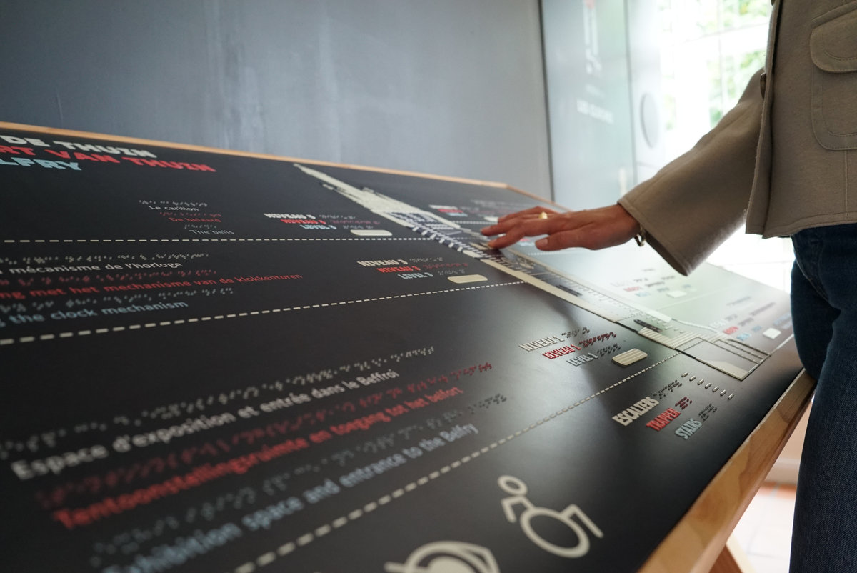 Nous avons également conçu une coupe en relief du Beffroi, permettant une meilleure compréhension de l’architecture de l’édifice aux personnes malvoyantes. Les panneaux d’information sont désormais trilingues, avec un contenu simplifié, respectant les contrastes visuels, une taille de police adaptée et de nouvelles iconographies pour faciliter la lecture. Un carnet en FALC peut accompagner les visiteurs qui en font la demande.