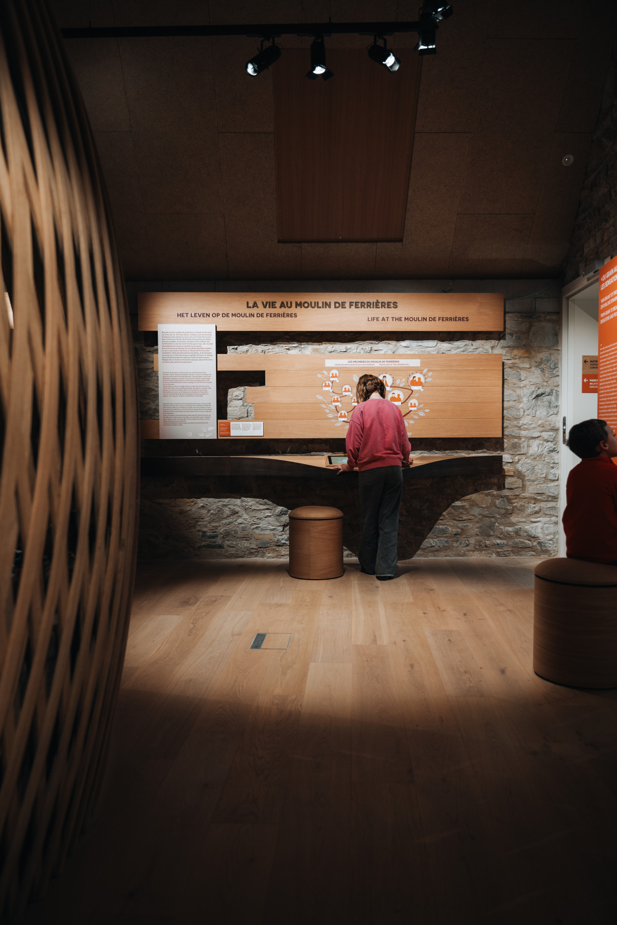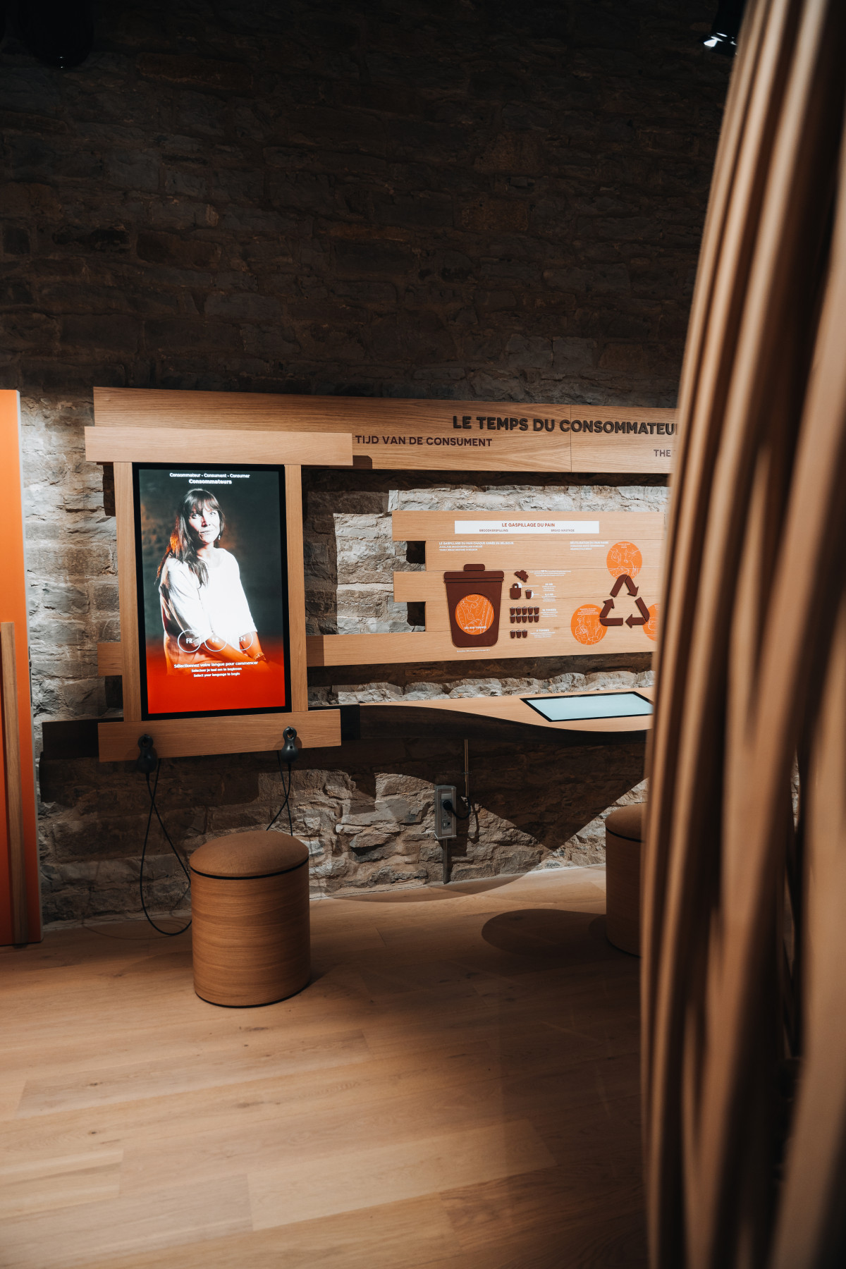 Kascen a développé avec Christophe Gaeta (Tramex Company) un parcours rythmé par différentes temporalités liées à la production de pain, allant de la journée de travail des agriculteurs, meuniers et boulangers jusqu’aux cycles plus longs comme les saisons ou la récolte. La visite met en lumière un retour aux pratiques anciennes de meunerie, abandonnées au 19e siècle et aujourd’hui réhabilitées, à l’image de la roue du moulin.
