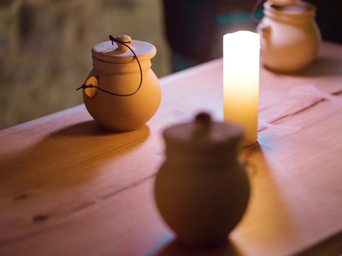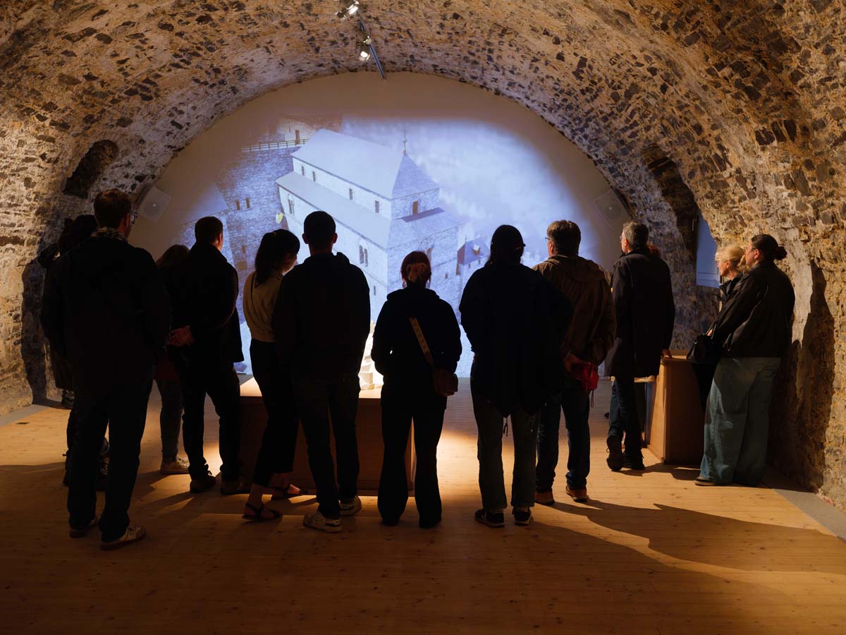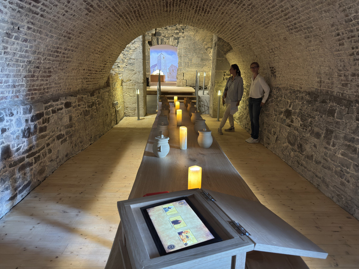 Dès la grande salle, une maquette donne les clés de compréhension d’un lieu à la fois résidence, centre administratif, religieux et militaire. Autour d’un banquet, la vie quotidienne se raconte, entre jeux participatifs, et reconstitutions olfactives qui ouvrent la porte des cuisines et des jardins du comte et de la comtesse.