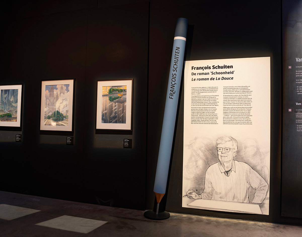 En écho au thème de cette expo temporaire qui a pris place à Trainworld en 2024, une signalétique faite de crayons surdimensionnés et de feuilles géantes présente les artistes et leur travail.