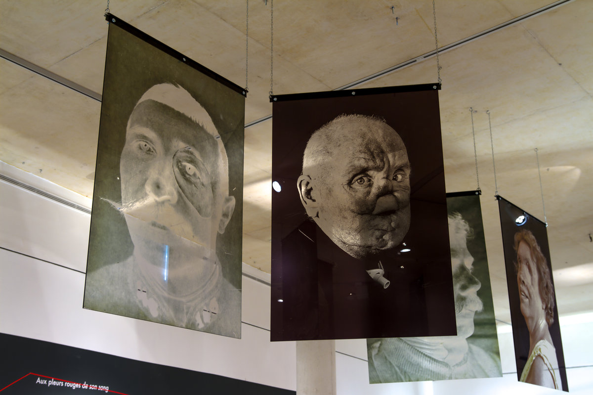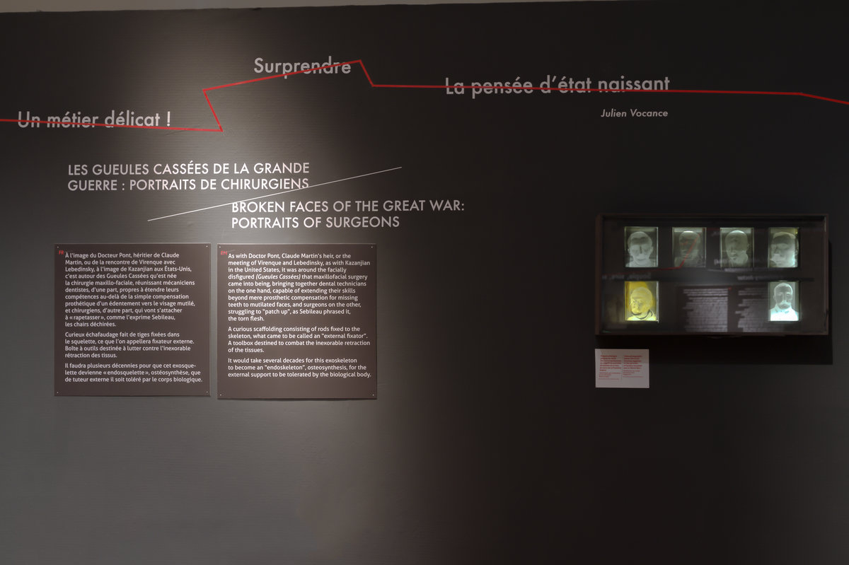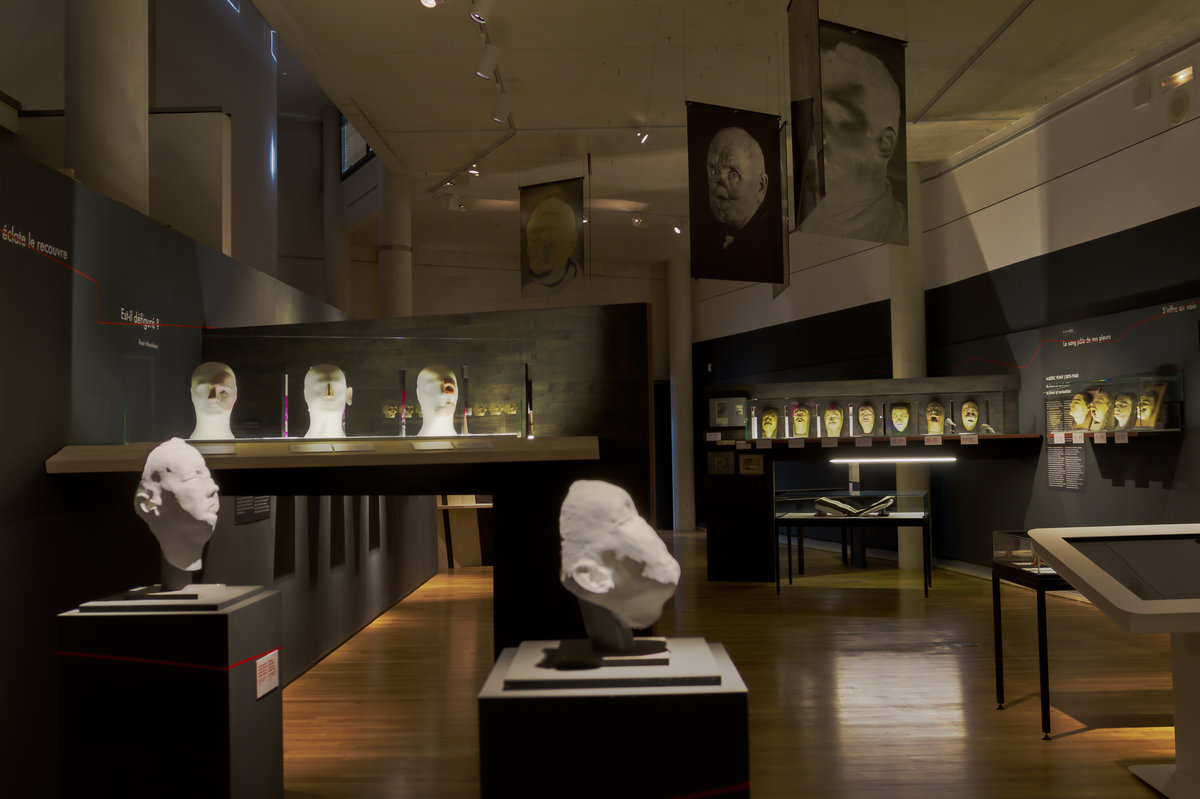 Notre défi pour cette exposition temporaire a été de mettre en place un parcours de visite et une scénographie qui médiatisent le contenu et permettent aux visiteurs d’être interpellés, sensibilisés, émus, interrogés pour oser porter un regard sur la défiguration, celle née de la grande guerre, mettre en miroir l’impensable défiguration que la malformation à travers une ligne de mobilier contemporaine jouant sur les brisures du miroir, sur la fragmentation et la blessure et la cicatrice.