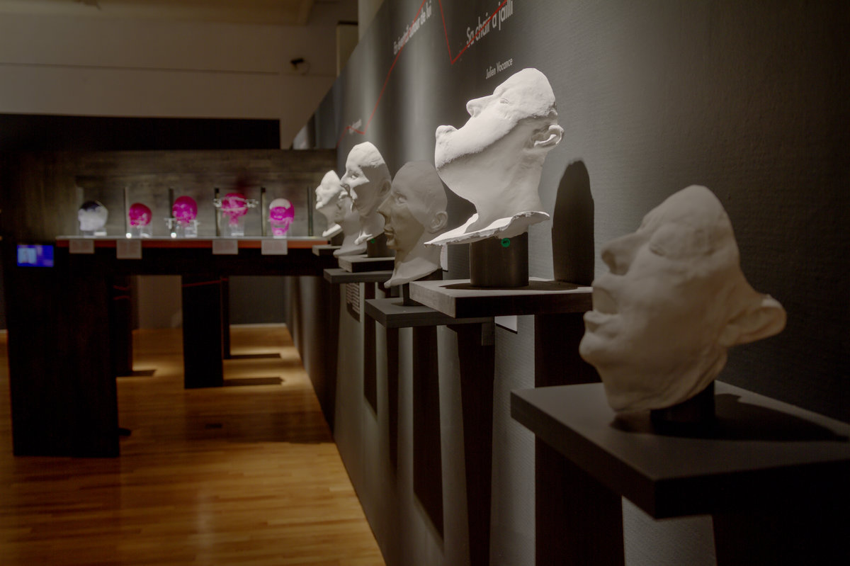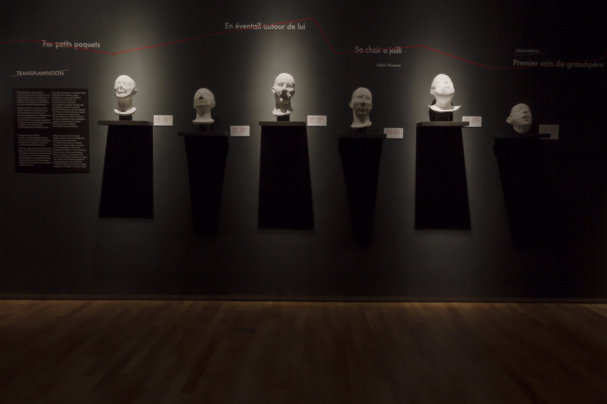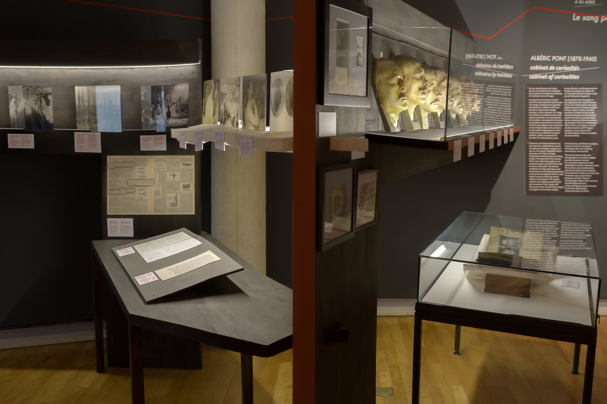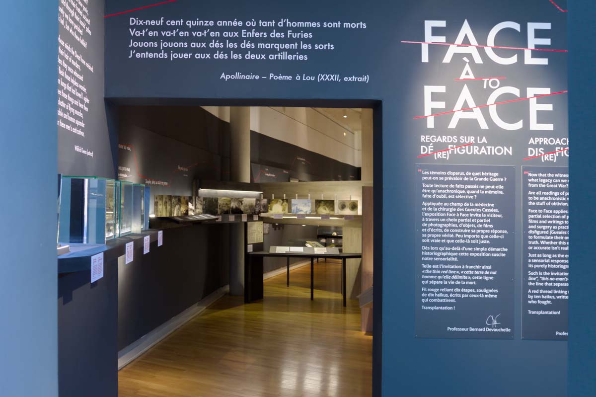 Notre défi pour cette exposition temporaire a été de mettre en place un parcours de visite et une scénographie qui médiatisent le contenu et permettent aux visiteurs d’être interpellés, sensibilisés, émus, interrogés pour oser porter un regard sur la défiguration, celle née de la grande guerre, mettre en miroir l’impensable défiguration que la malformation à travers une ligne de mobilier contemporaine jouant sur les brisures du miroir, sur la fragmentation et la blessure et la cicatrice.