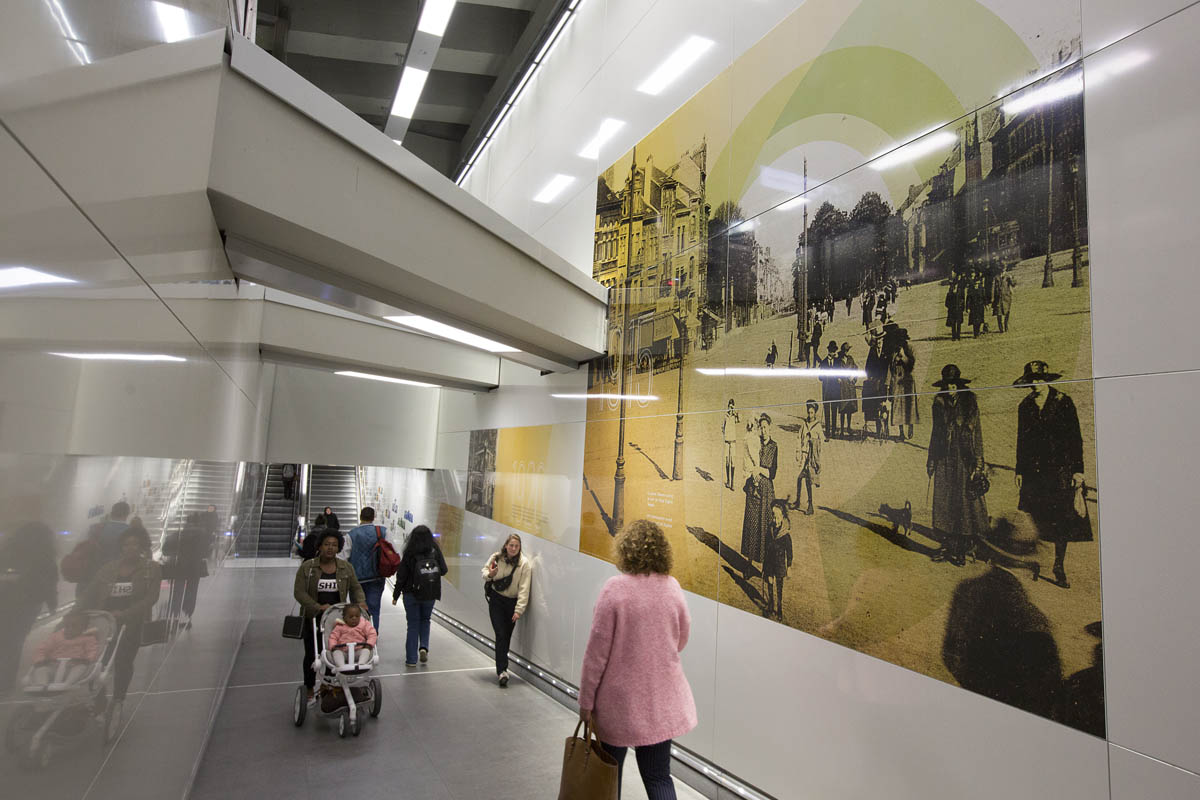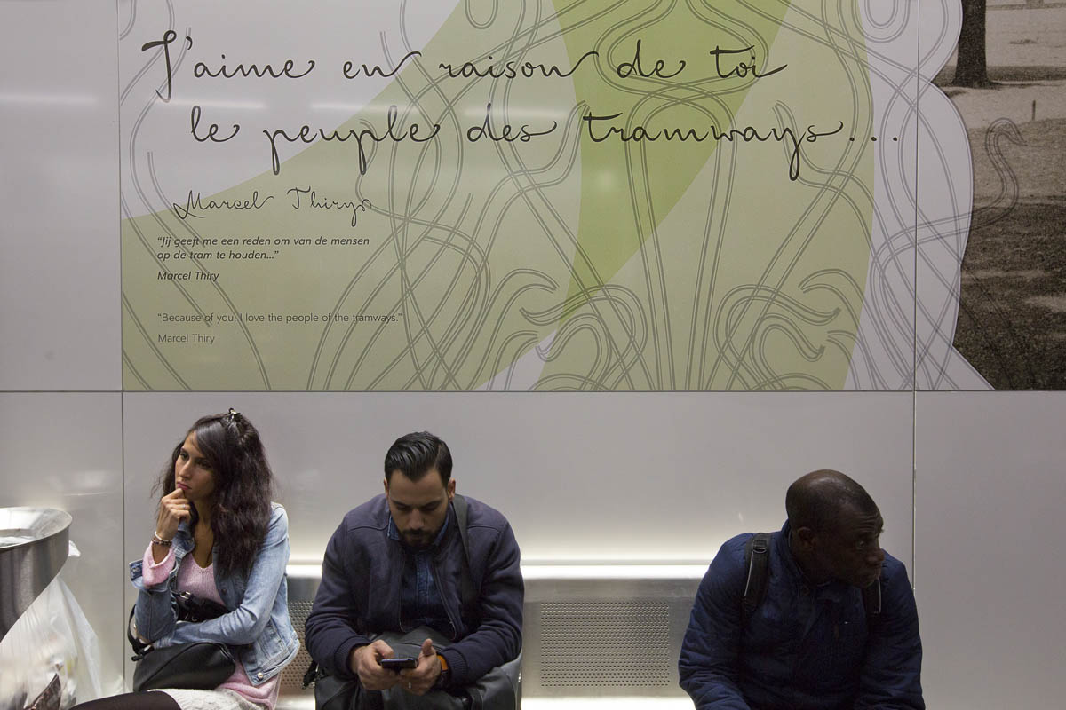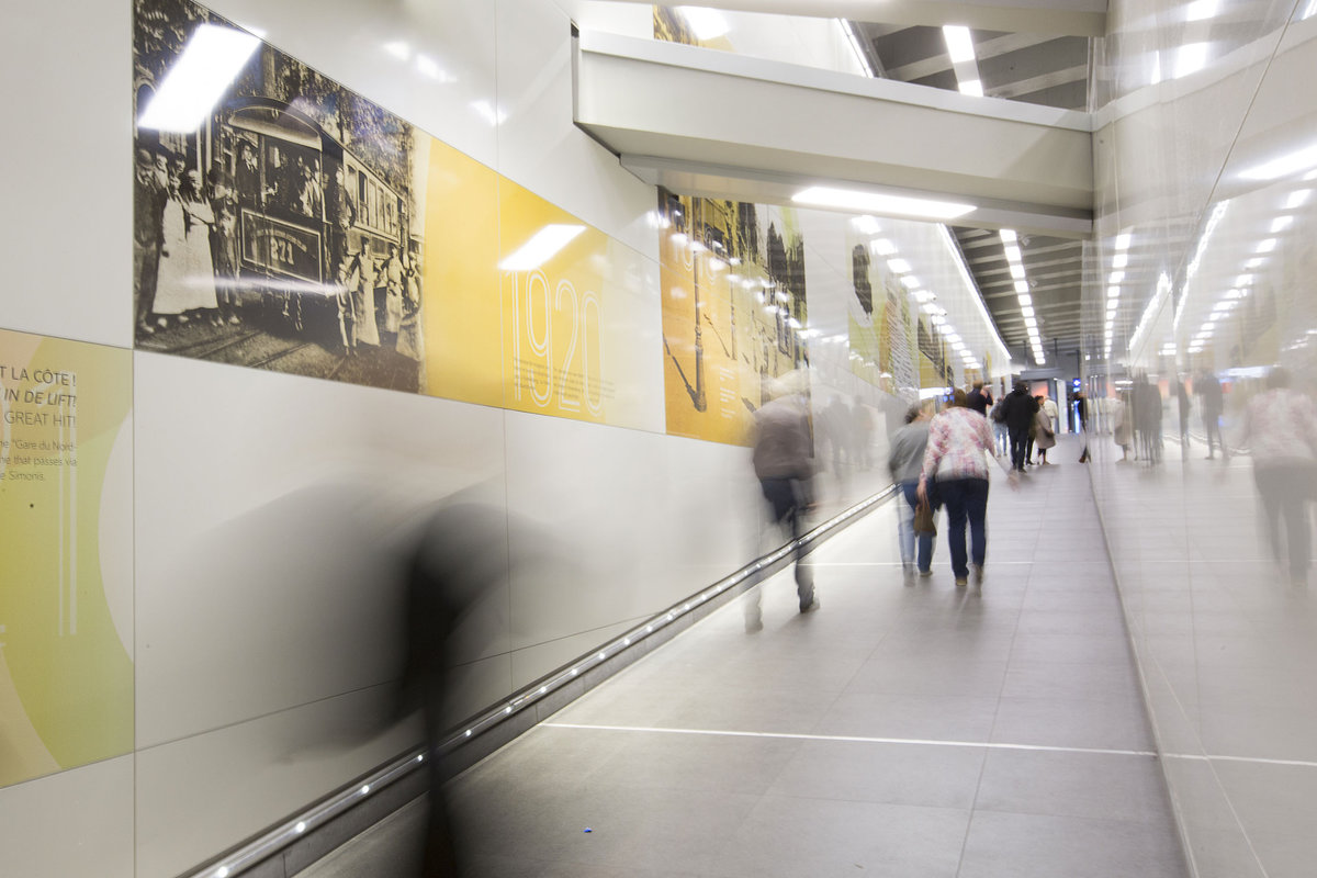 Ici commence le voyage ! Grâce à un nouvel habillage scénographique et graphique imaginé par l’agence Kascen à la demande du service public de la mobilité de Bruxelles-Capitale et de la Société des transports bruxellois, 2000m2 de panneaux de tôle émaillée proposent aux usagers des transports une déambulation, entre quais et couloirs de liaison, dans l’histoire du tram et des transports à Bruxelles, ainsi que l’impact du développement des transports dans l’évolution du quartier où se situe la station Simonis. De grands visuels reprenant des images d’archives recolorisées y sont déployés et se conjuguent avec des citations d’auteurs tels Jacques Brel ainsi que des récits d’anonymes.