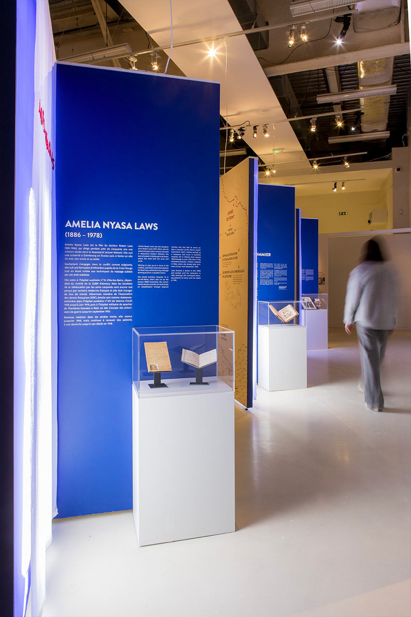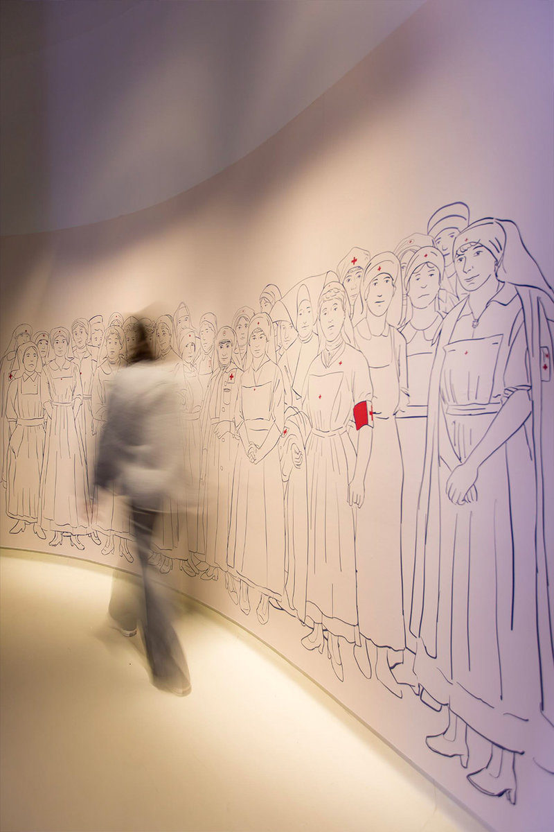 Utilisant comme motif-phare de la scénographie et du graphisme la trame textile omniprésente dans l’univers des infirmières (draps, coiffes, bandages etc.), nous concevons un parcours « à hauteur de femme ». Minutieusement mis en lumière, une demie-douzaine de portraits disséminés le long du parcours constituent un fil rouge marquant.