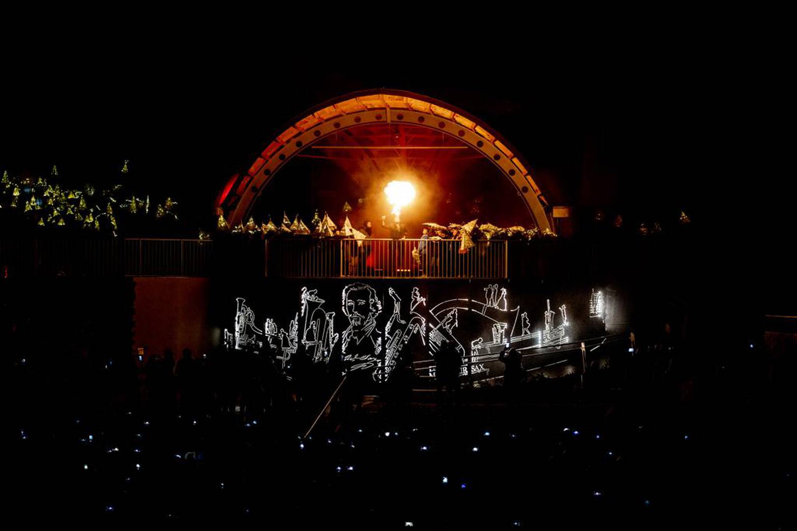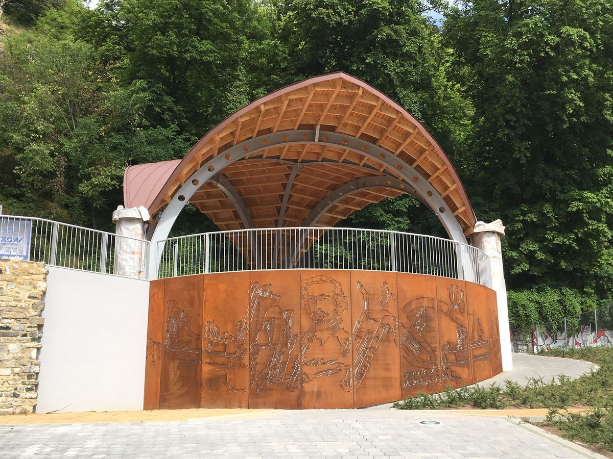 Adolphe Sax, natif de Dinant, est le génial inventeur de nombreux instruments de musique dont l’incontournable saxophone. Ce kiosque à musique situé au centre-ville rend hommage au génie créatif de cet illustre dinantais. Une fresque graphique découpée dans la tôle d’acier Corten rappelle les inventions fantasques, les caricatures dont Sax faisait l’objet et les réactions outragées de l’époque. Cette grande illustration tourne tout autour de l’architecture pour habiller tout le sous-bassement. À la nuit tombée, les découpes s’illuminent pour révéler encore davantage la créativité dinantaise.