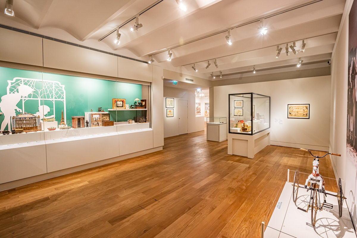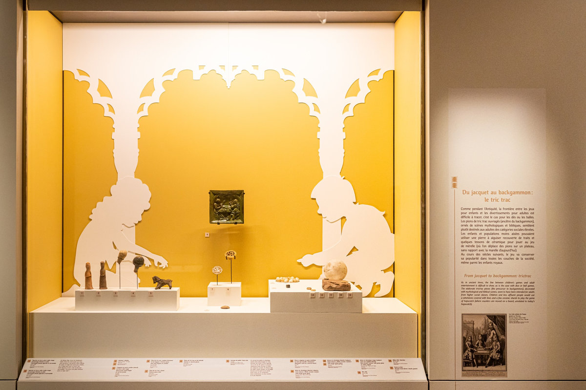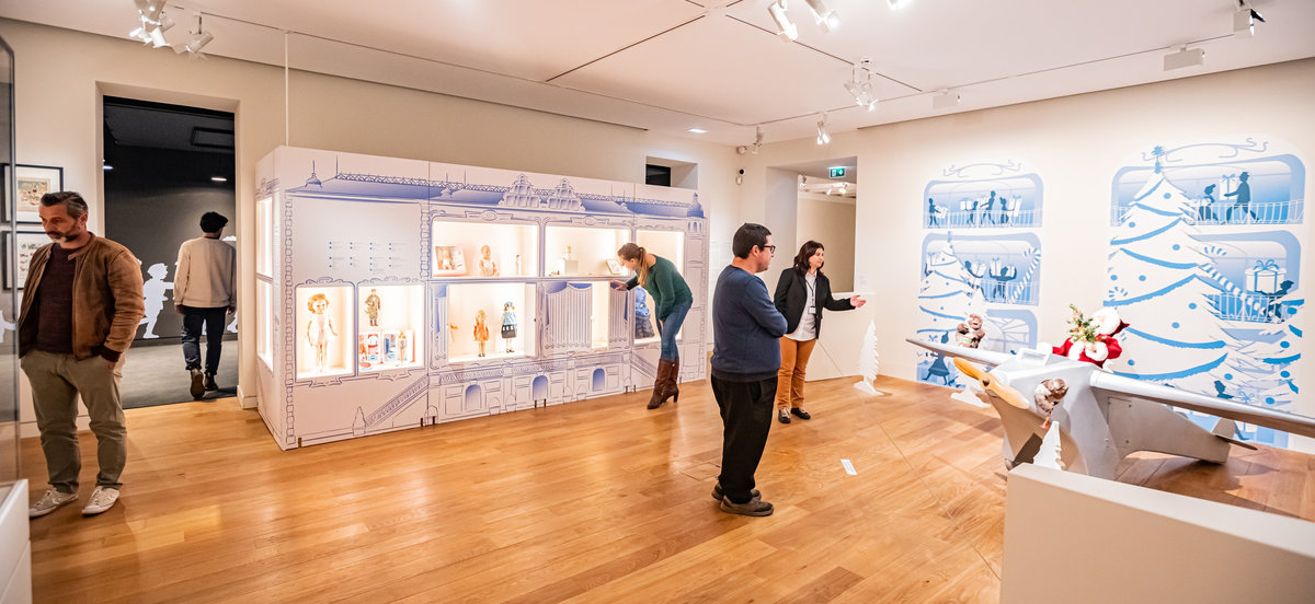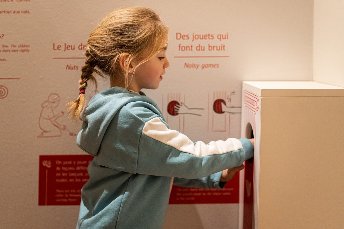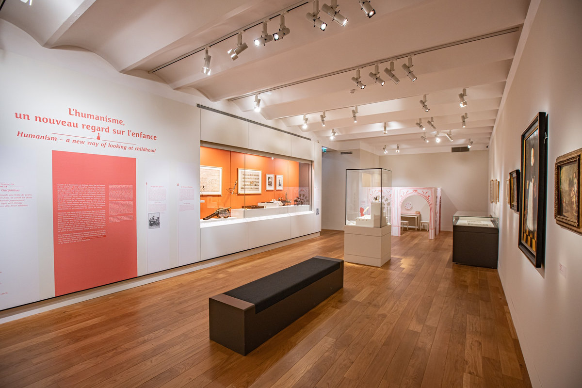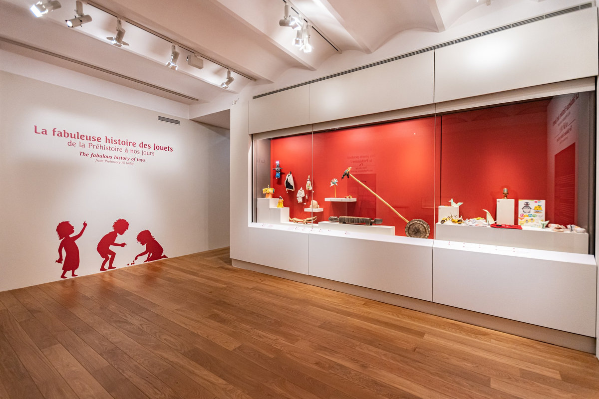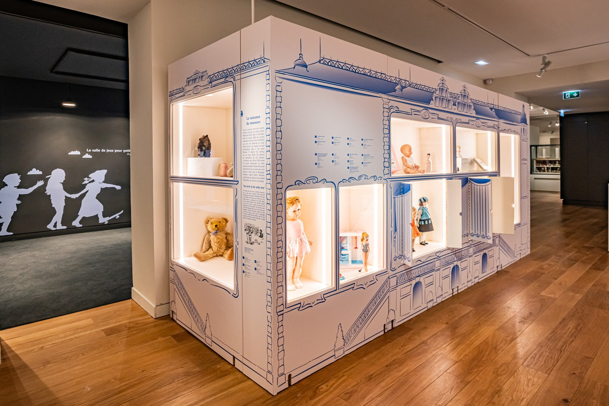 Pour servir le propos du commissariat assuré par Anne Monier du Musée des Arts Décoratifs (Paris), nous avons travaillé à réinsuffler de la vie aux pièces exposées : soclage dynamique, silhouettes enfantines s’invitant en vitrines ou clins d’œil poétiques sous forme de projection animant le parcours. Des « enfants ambassadeurs » accueillaient le jeune public au sein de « cabanes » proposant la manipulation de fac-similés de jouets anciens. La circulation entre les différents niveaux du bâtiment était gamifiée sous forme de jeu de l’oie géant.