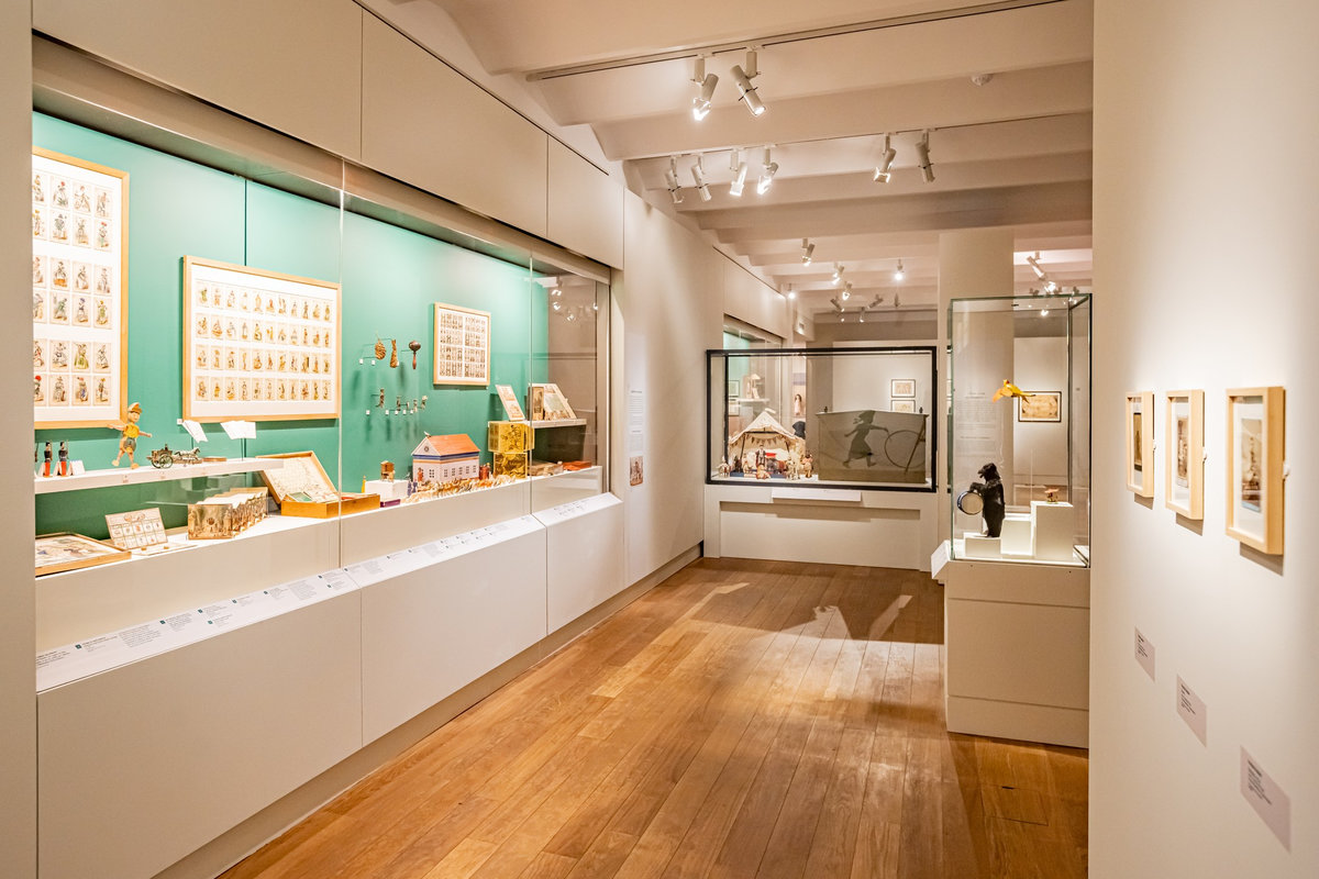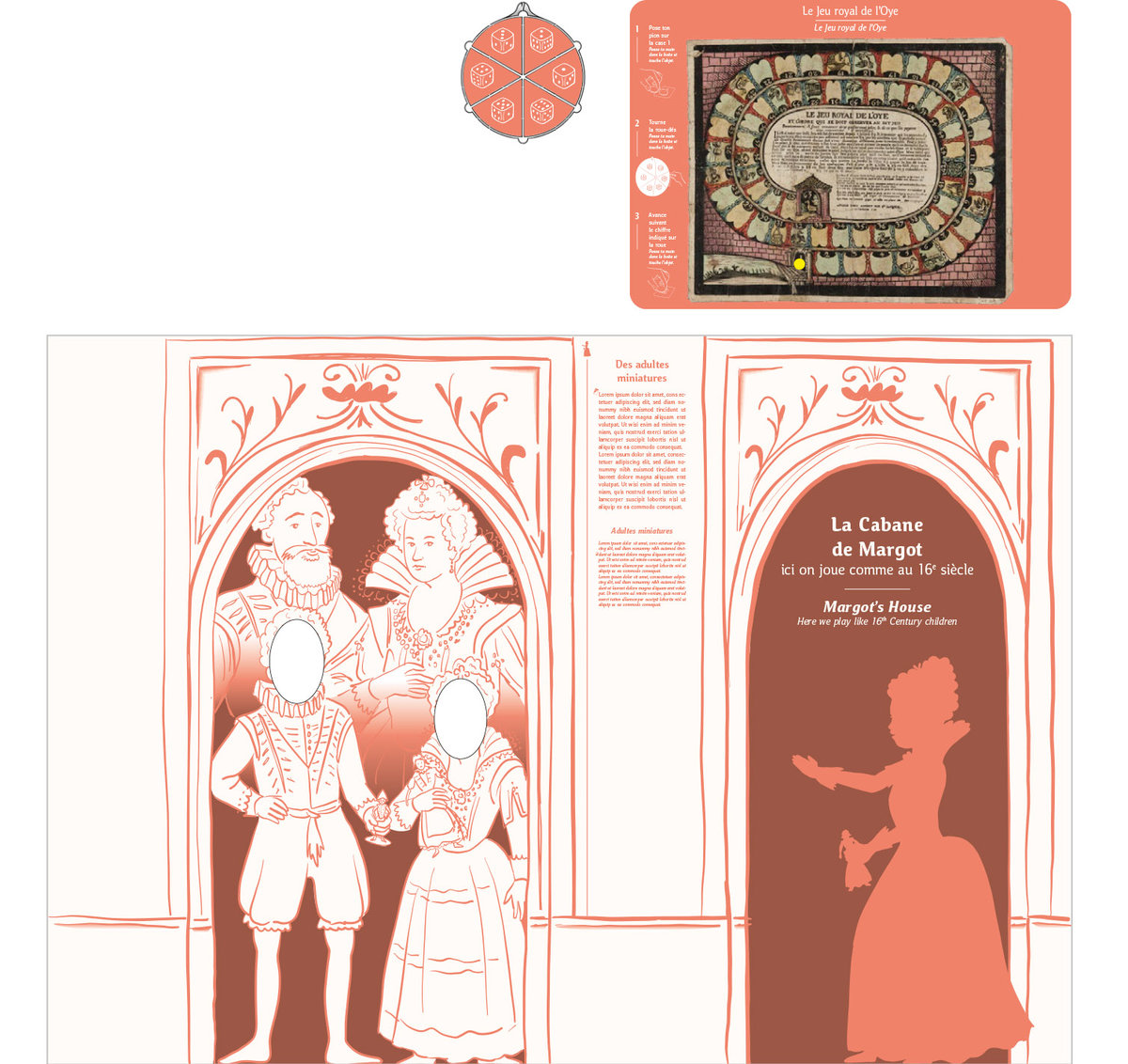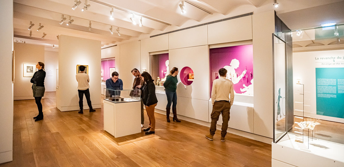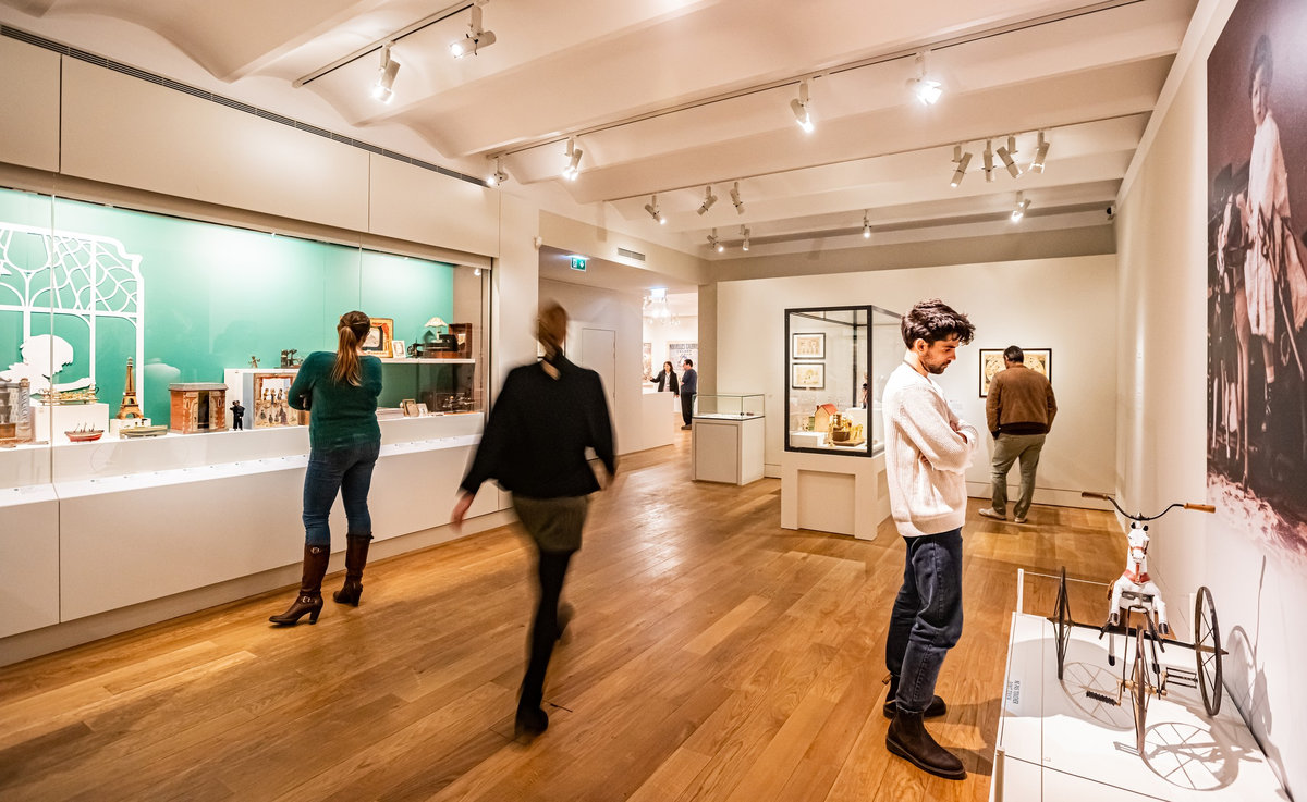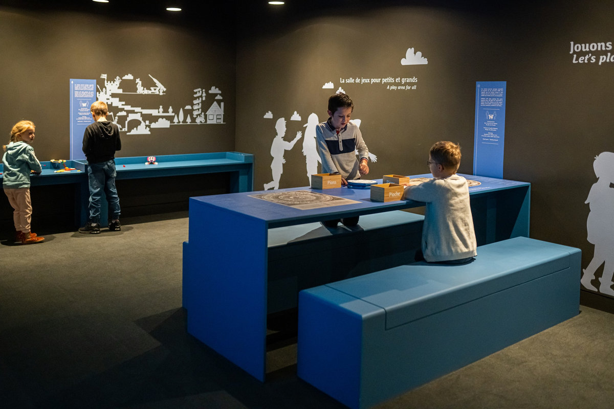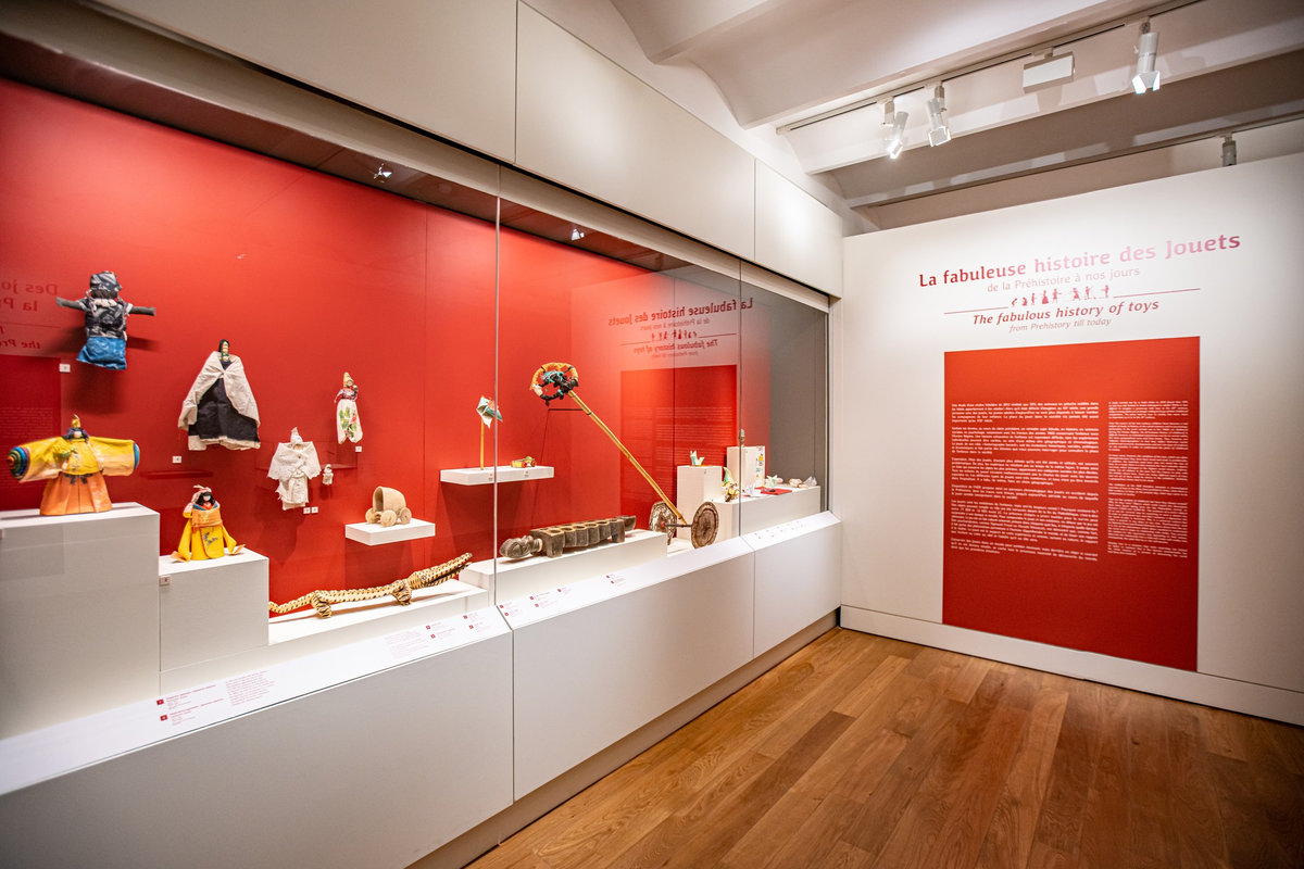 Pour servir le propos du commissariat assuré par Anne Monier du Musée des Arts Décoratifs (Paris), nous avons travaillé à réinsuffler de la vie aux pièces exposées : soclage dynamique, silhouettes enfantines s’invitant en vitrines ou clins d’œil poétiques sous forme de projection animant le parcours. Des « enfants ambassadeurs » accueillaient le jeune public au sein de « cabanes » proposant la manipulation de fac-similés de jouets anciens. La circulation entre les différents niveaux du bâtiment était gamifiée sous forme de jeu de l’oie géant.