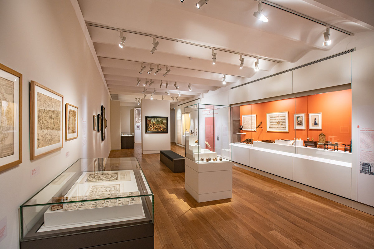 Cet exigeant projet a demandé un rigoureux travail de modélisation des collections afin de concevoir des plans de vitrines millimétrés. Nous avons veillé à limiter son impact environnemental, notamment en privilégiant le réemploi d’un stock de vitrines et cimaises disponibles, le graphisme étant chargé de donner vie aux ambiances, plutôt que des décors construits.